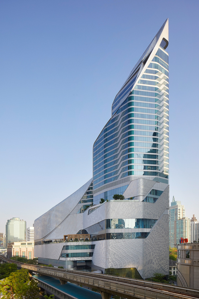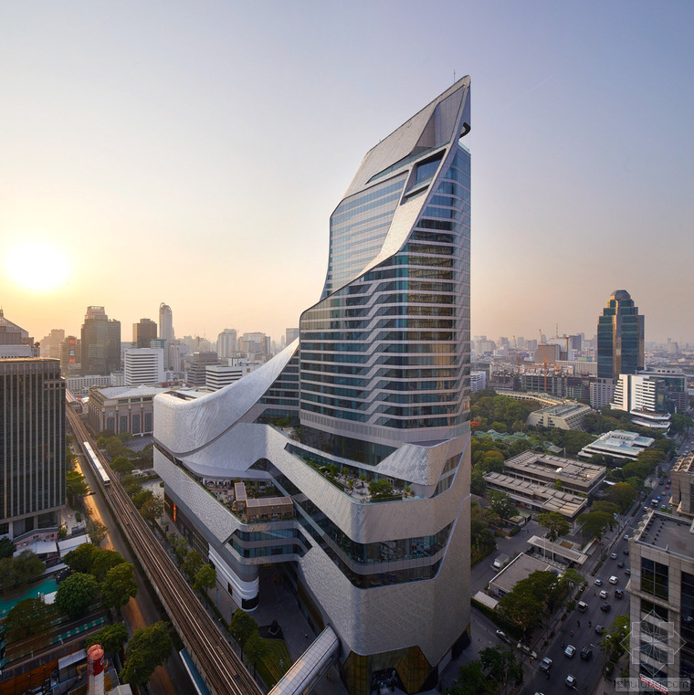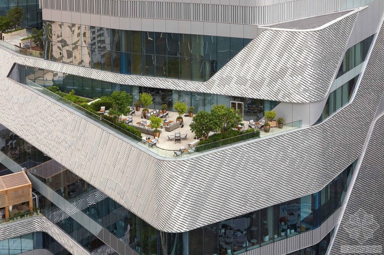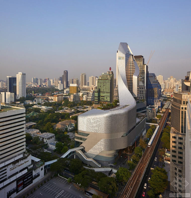 曼谷中心大使館為曼谷這座城市帶來了全新的印象,無論是從街道還是從天際線來看,它都展示出一種邀請的姿態(tài),歡迎曼谷人和全世界人來參觀。項目位于之前英國大使館的花園中,沿著曼谷最重要的商業(yè)干道 Ploenchit 大路,占地150萬平方英尺(約139萬平方米)的綜合體包括一個7層的奢侈品零售區(qū)和27層的五星級 Hyatt 酒店塔樓。這座塔是第一個英國建筑師在泰國完成的項目。酒店和購物中心使用連續(xù)循環(huán)的形式,使裙房和塔樓更直接的結(jié)合在一起。塔樓連續(xù)的線條似乎打破了裙房的大體量,在尺度上創(chuàng)造了一種非對稱的結(jié)構(gòu)。這種形式的開放,包容了城市并且建立了一種相互的視野,一系列的室外平臺和露臺可以看到彼此。兩個垂直的光井,完全的打開塔樓內(nèi)部空間,可以看到層層疊疊不斷向上變化的平臺,同時這些平臺又劃分了酒店的功能:面對 Nai Lert 公園的私人會客空間、酒吧、接待休息室和面向市中心的天臺。