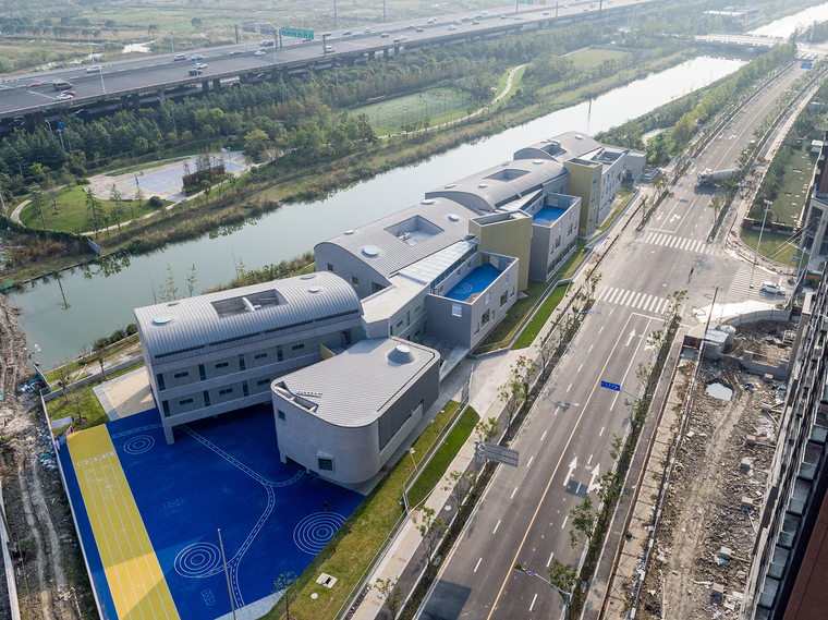 幼兒園是孩子們在成長過程中第一個接觸的公共空間??臻g的尺度、使用的靈活度以及室內(nèi)的場景和氛圍,對于幼兒的感受和認(rèn)知都有很大影響,對于建筑師也是一個挑戰(zhàn)。設(shè)計要能激發(fā)孩子們探索和學(xué)習(xí)的興趣,同時要給他們足夠的安全感,要有家的感覺。在調(diào)研期間,設(shè)計團隊也發(fā)現(xiàn),非正式空間-如活動室前的走廊-往往是孩子們生活、交往、嬉戲的重要場所。功能、空間與環(huán)境的關(guān)系,是本案在設(shè)計初始所面臨的主要矛盾和核心議題。張江萬科實驗幼兒園位于一個狹長的三角形地塊?;啬蟼?cè)為中環(huán)路高架與河道綠化,北側(cè)為高層住宅區(qū),東側(cè)為一座跨河道的車行橋,西側(cè)則為一棟需要容納在場地內(nèi)的區(qū)域環(huán)網(wǎng)站。要做出一個回應(yīng)場地限制條件并符合教育局規(guī)范標(biāo)準(zhǔn)的15個班全日制幼兒園,這塊特殊的基地便顯得極具挑戰(zhàn)性。建筑師需要在滿足規(guī)劃指標(biāo)、使用面積、規(guī)范性、安全性等硬性要求的前提下,在一個相對局促的場地里,創(chuàng)造出符合老師教學(xué)管理、誘發(fā)兒童探索心理、和滿足家長預(yù)期的幼兒園。