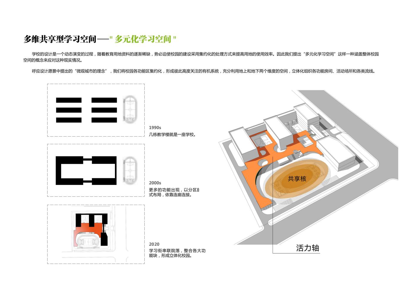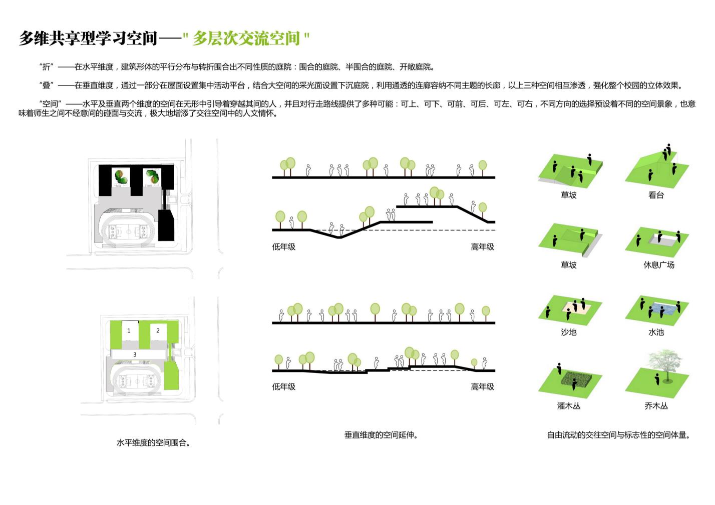 “雙地下”概念是將操場(chǎng)以下的土地進(jìn)行有效利用,將2F綜合樓地下以及操場(chǎng)地下一層作為食堂使用,內(nèi)部包含廚房以及教職工食堂,建筑面積為5460平方,可容納3000人。將食堂的北側(cè)以及西側(cè)設(shè)置6M以上寬的下沉庭院,解決食堂的采光通風(fēng)問(wèn)題,也結(jié)合樓梯踏步與景觀設(shè)計(jì)增加學(xué)生的趣味性。第二個(gè)地下就是學(xué)校西側(cè)地下一層作為教師的內(nèi)部停車(chē)庫(kù),可停放200輛車(chē)輛,面積為7500平,操場(chǎng)的地下二層設(shè)置地下接送系統(tǒng),作為家長(zhǎng)接送孩子的專用停車(chē)庫(kù),可停放160輛車(chē)輛,面積為5200平方,內(nèi)部設(shè)置閘機(jī),家長(zhǎng)等候區(qū),閱讀區(qū),學(xué)生刷卡出校后家長(zhǎng)手機(jī)會(huì)接收到短信,便捷的接送到孩子。緩解了學(xué)生上下學(xué)學(xué)校附近的交通壓力。